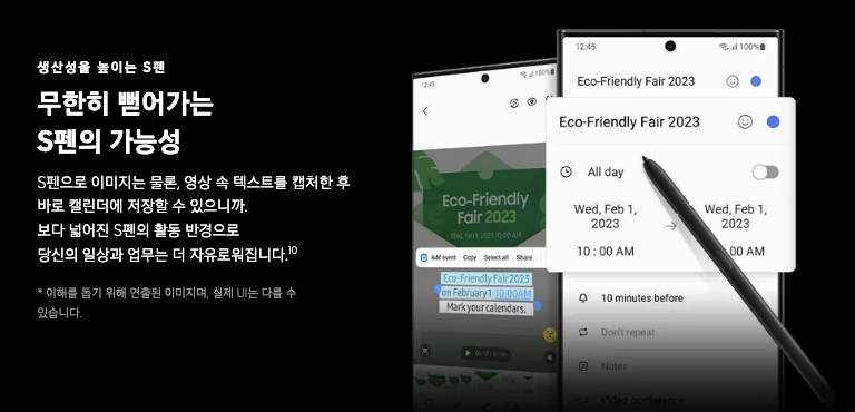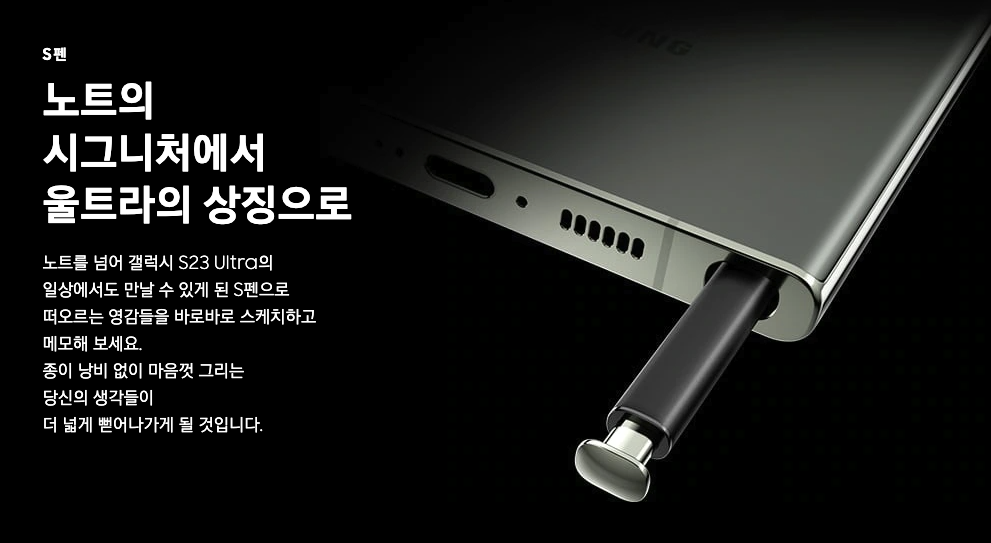 갤럭시 노트 시리즈에 사용되었던 S펜이 갤럭시 S23 울트라에서 다시 태어났습니다. S펜 탑재로 갤럭시 S23 울트라의 생산성은 향상되었습니다.