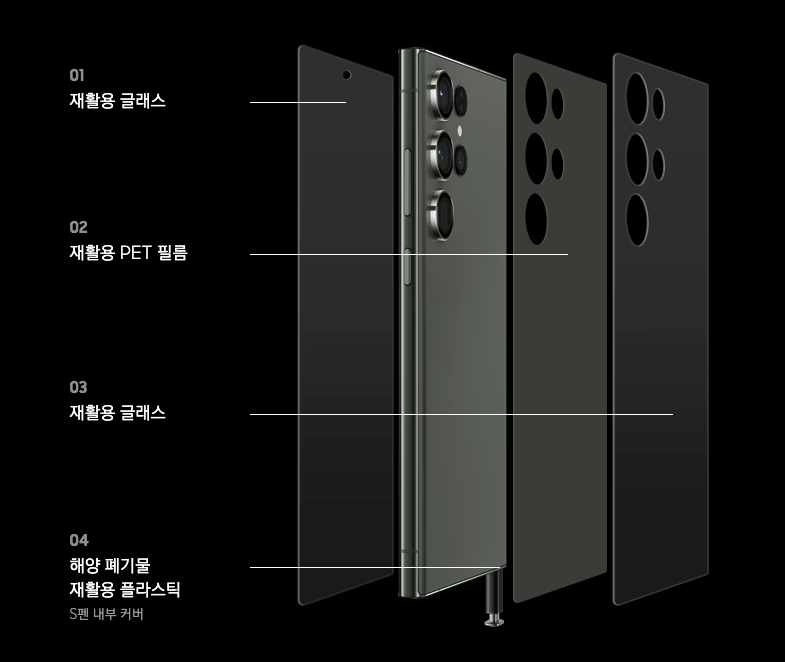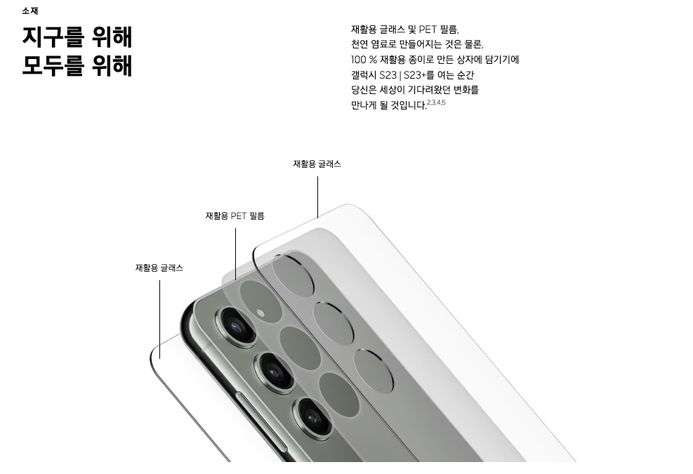 갤럭시 S23 시리즈는 핸드폰 본체는 글래스부터 뒷면까지 재활용 제품을 사용한 친환경 제품입니다. 제품뿐 아니라 제품을 담는 박스 또한 재활용 종이박스를 사용한 친환경 제품입니다.