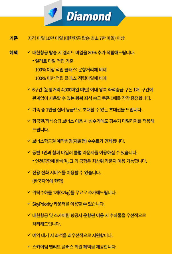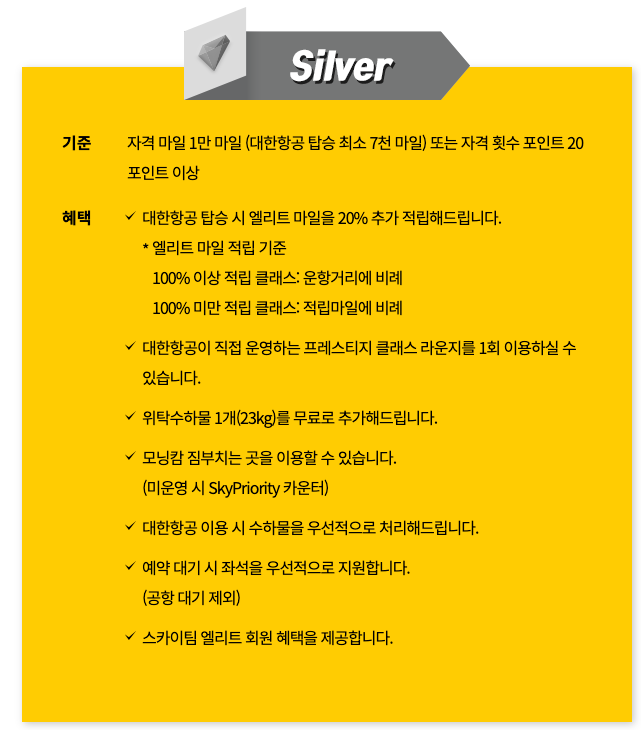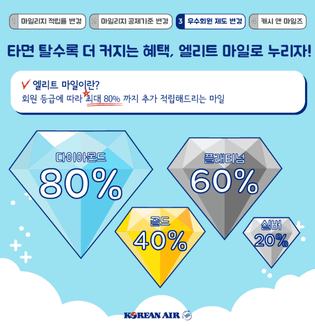 새로 변경하는 우수회원 제도는 실버 등급부터 시작이며, 자격 요건은 1만 마일 이상(대한항공 7천 마일 이상) 혹은 자격 횟수 포인트 20 포인트 이상입니다. 최고 등급인 다이아몬드 자격 요건은 10만 마일(대한항공 7만 마일)입니다. 기존 밀리언마일러와 비교하면 등급 달성 조건이 많이 낮아졌습니다. 등급에 따라 추가 적립 마일리지도 기존 제도와 다른 점입니다.