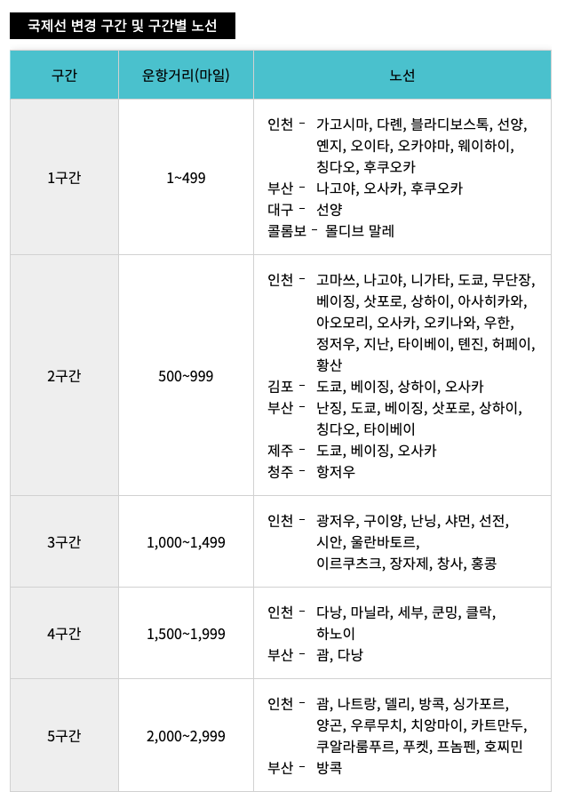 아래 구간별 노선을 통해 운항거리(마일) 별 구간을 확인할 수 있습니다. 편도기준 4구간까지는 500마일씩 구분되어 있고, 5구간부터 9구간까지는 1,000마일씩 구분되어 있습니다.