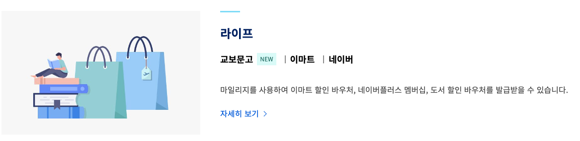 마일리지를 사용하여 바우처(교보문고 할인권, 이마트 할인권, 네이버 멤버십 월간이용권)를 구매할 수 있습니다.