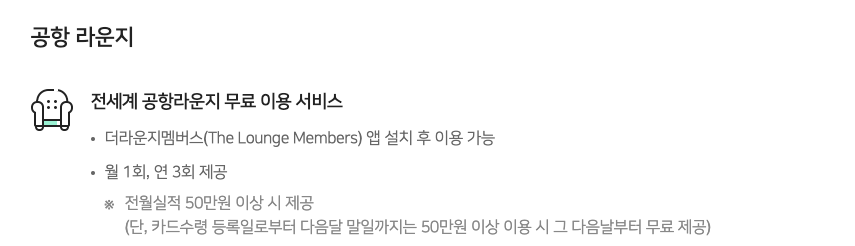 연회비 3만 9천 원으로 기본적으로 1 천원당 대한항공 스카이패스 1마일리지를 적립해주고 해외에서 일시불로 결제할 경우 추가로 1마일을 더 제공해 1천원당 2마일을 제공해주고 있습니다. 그리고 전 세계 공항라운지 무료이용 서비스를 연 3회 제공하고 있습니다.