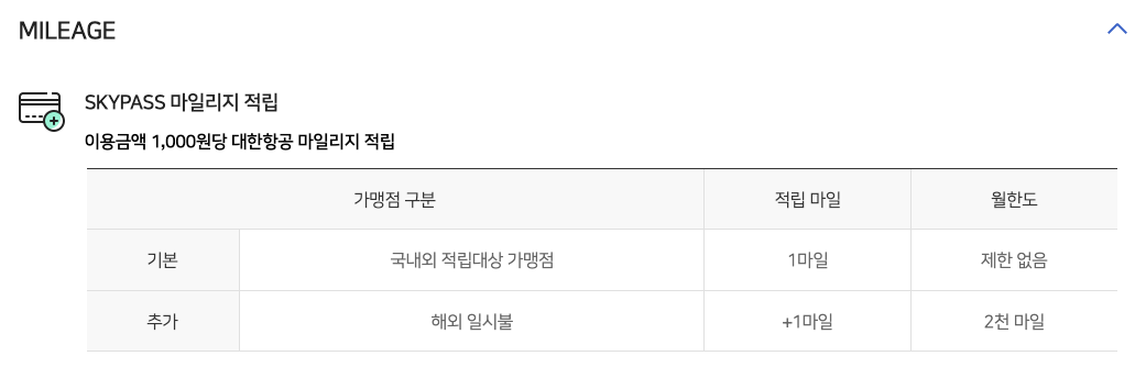 이 카드는 연회비 2만 원으로 저렴한 편에 속합니다. 기본적으로 1 천원당 1마일리지를 적립해주고 있고, 해외에서 결제시 추가로 1마일리지를 제공하여 1천원당 2 마일리지를 적립해주고 있습니다. 그 외에 혜택은 놀이공원 할인 등이 있지만 대한항공 마일리지와 연관이 없어 언급을 따로 하지 않겠습니다. 저렴한 연회비에 적립에만 신경을 쓰는 사용자에게 적합한 카드 같습니다.