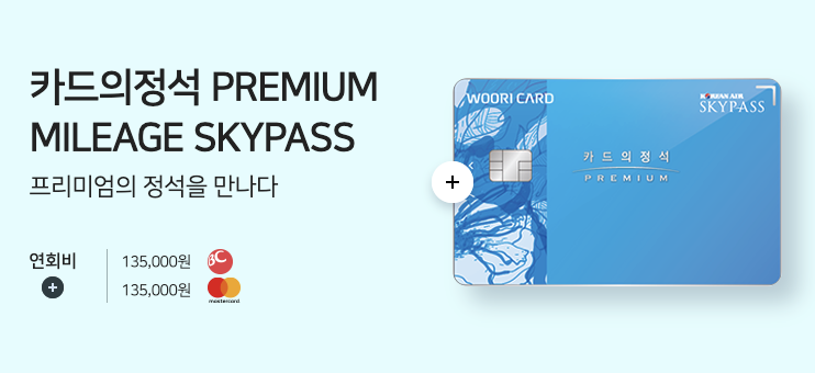 우리 카드에서는 3가지의 대한항공 마일리지 적립 신용카드가 있습니다. 카드의 정석 마일리지, 프리미엄 마일리지, 로얄블루 마일리지가 있습니다. 3가지 카드 모두 1 천원당 1 마일리지는 기본적으로 적립이 되고 있습니다. 카드별로 연회비가 다르고 연회비가 비쌀수록 다양한 서비스를 제공해주고 있습니다. 우리 카드는 카드 발급 시, BC, 마스터, 비자 중 카드사 선택을 할 수 있습니다.