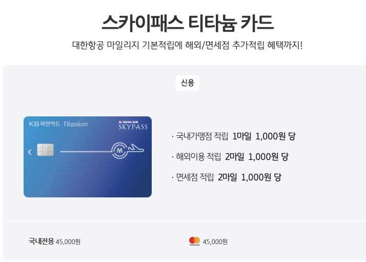 연회비 4만 5천 원인 스카이패스 티타늄 카드는 1 천원당 1마일리지를 적립해주고 특별 적립으로 해외 이용과 면세점 이용 시 1마일리지를 추가로 적립해 1천원당 2 마일리지를 적립해주고 있습니다. 공항 라운지 연 2회 서비스를 제공하고 연 12회 국내 호텔 발레파킹 무료 서비스를 제공하고 있습니다. 연회비 4만 5천 원 수준의 카드 중 호텔 발레파킹 서비스는 사용자에 따라 혜자혜택이 될 수 있습니다.