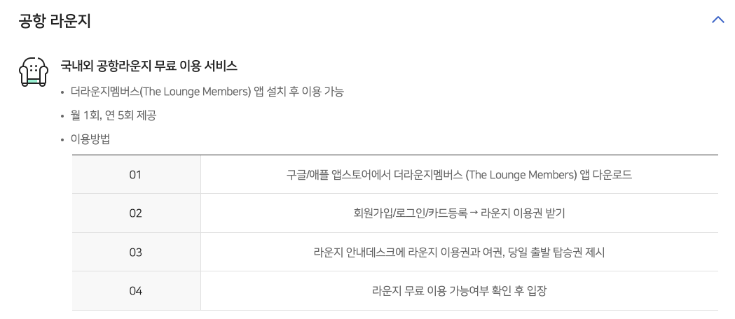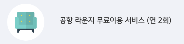 연회비 3만 9천 원으로 기본적으로 1 천원당 대한항공 스카이패스 1마일리지를 적립해주고 해외에서 일시불로 결제할 경우 추가로 1마일을 더 제공해 1천원당 2마일을 제공해주고 있습니다. 그리고 전 세계 공항라운지 무료이용 서비스를 연 3회 제공하고 있습니다.