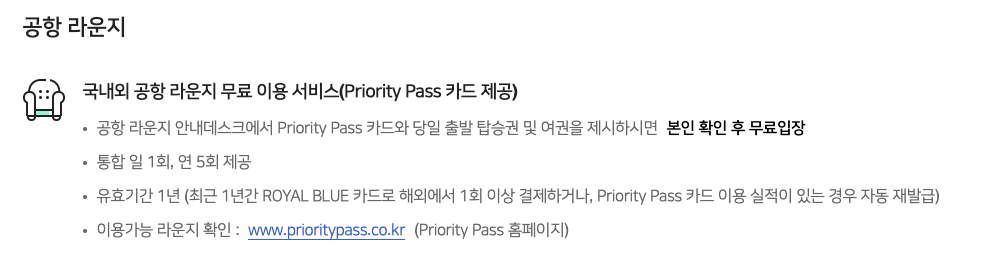 우리 카드의 프리미엄 카드인 로얄 블루 마일리지 카드는 연회비가 33만원 입니다. 프리미엄 기프트를 제공하여 사용자는 페이백 받는 효과를 느낄 수 있습니다. 위 2카드가 공항 라운지 무료 이용을 어플을 통해서 하였지만, 로얄 블루 마일리지는 일명 PP카드(Priority Pass)를 제공하고 있습니다.