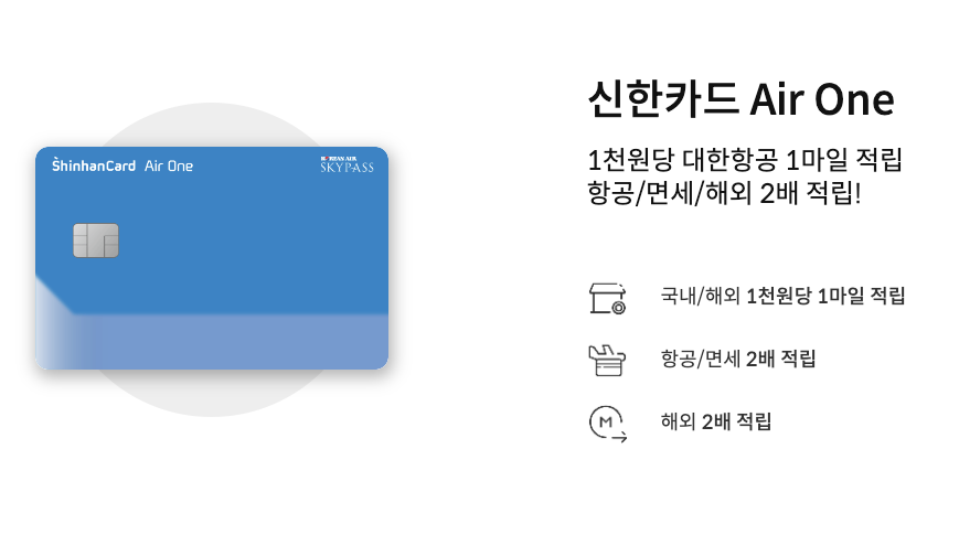 신한카드는 3가지 마일리지 적립 신용카드가 있지만, 그중 1가지 카드만 1 천원당 1 마일리지 적립을 제공하고 있습니다.