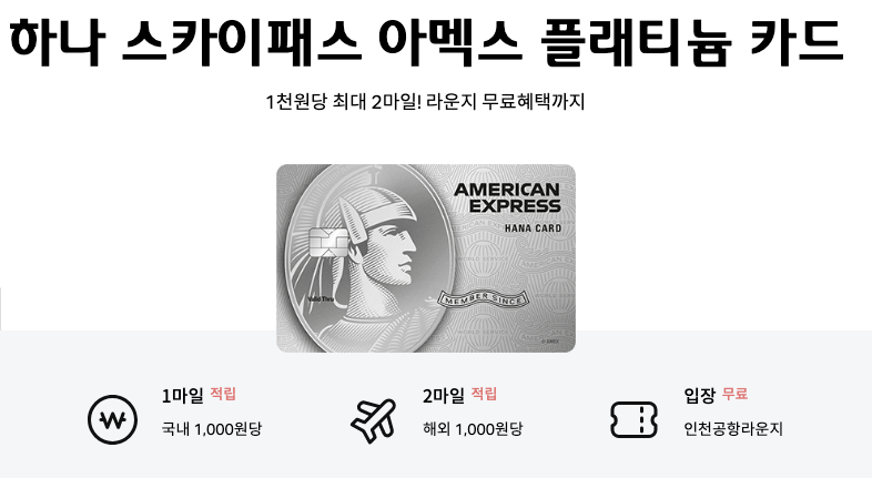 하나카드에는 3가지의 대한항공 적립 카드가 있지만, 1,500원에 1 마일리지 적립은 다른 카드에 비해 메리트가 떨어지는 거 같아서 1 천원당 1마일리지를 적립해주는 하나 스카이패스 아멕스 플래티늄 카드만 정리하였습니다.
