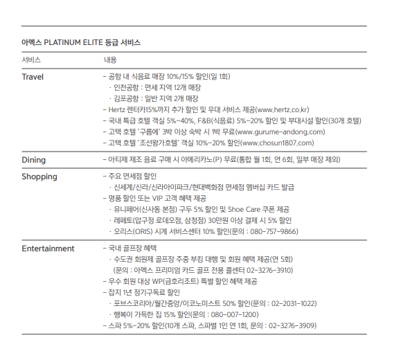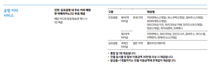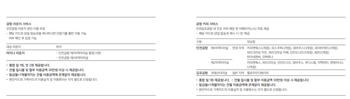 삼성카드는 아맥스 플래티넘, 아맥스 플래티넘 엘리트 서비스를 제공하고 있습니다. 주요 혜택으로 공항 발레파킹 무료, 공항 커피 무료 제공, 라운지 서비스 등이 있습니다. 저는 출국 시 공항에서 라운지 서비스와 무료 커피 서비스를 알차게 이용하였습니다.