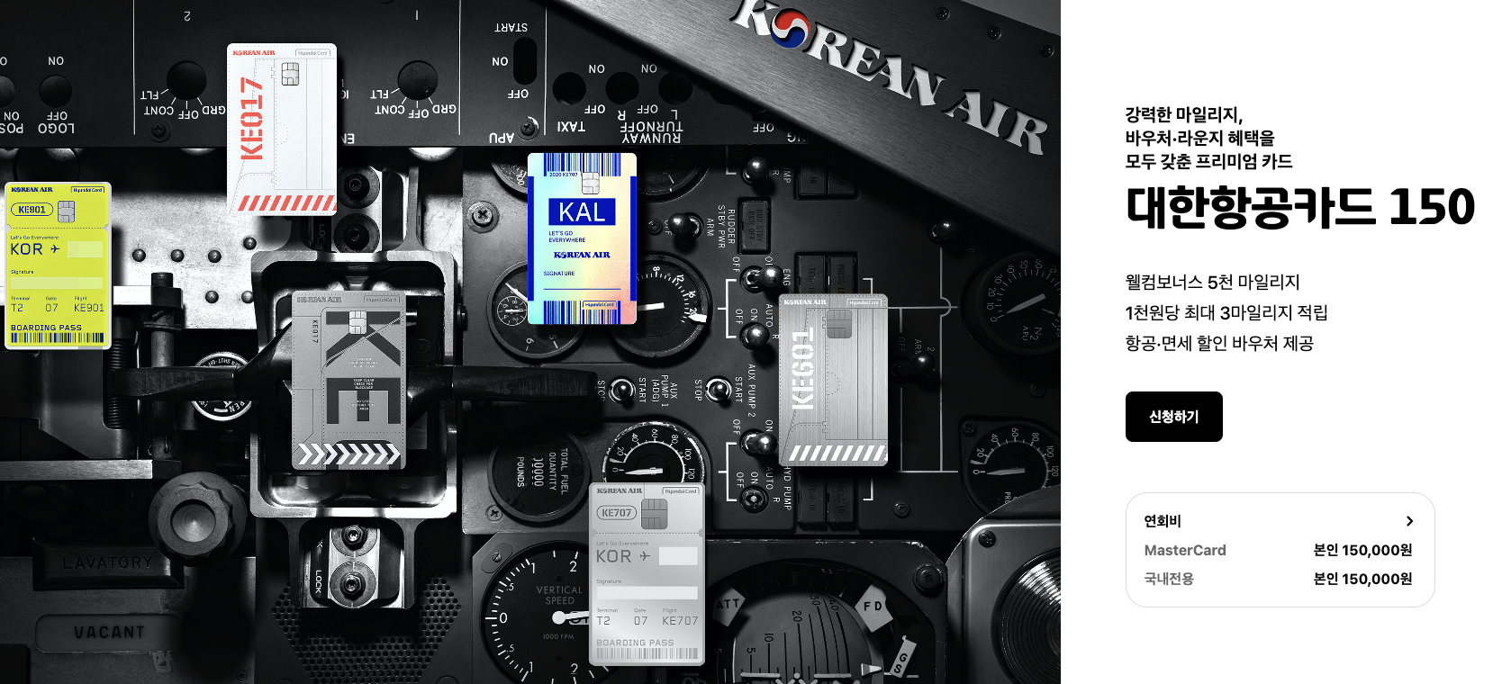 현대 카드 150은 연회비가 15만 원이며, 웰컴보너스로 먼저 5천 마일리지를 적립하여 주고, 누적금액 100만 원 이용 시 추가로 5천 마일리지를 적립하여 줍니다. 특별 마일리지를 통해 최대 1 천원당 3 마일리지를 적립할 수 있습니다.