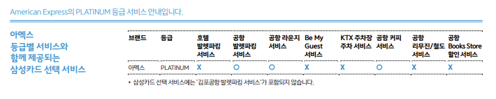삼성카드는 아맥스 플래티넘, 아맥스 플래티넘 엘리트 서비스를 제공하고 있습니다. 주요 혜택으로 공항 발레파킹 무료, 공항 커피 무료 제공, 라운지 서비스 등이 있습니다. 저는 출국 시 공항에서 라운지 서비스와 무료 커피 서비스를 알차게 이용하였습니다.