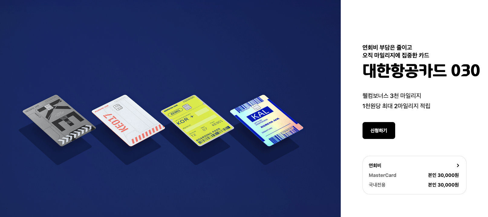 현대 카드 030은 연회비 3만 원이며, 웰컴보너스로 3천 마일리지를 적립하여 줍니다. 특별마일리지로 1 천원당 최대 2 마일리지를 적립할 수 있습니다. 연회비가 위 3가지 카드보다 저렴하기 때문에 030 카드는 공항 라운지 이용이 없는 적립만 할 수 있는 카드입니다.