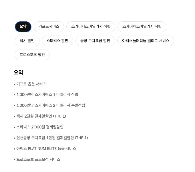 THE 1 카드는 연회비가 25만 원으로 다소 비싸지만, 1년에 1회 기프트서비스를 제공해 주어서 체감상 연회비가 비싸지 않게 느껴집니다. 25만 원 연회비를 내면 15만 원 신세계상품권 혹은 호텔식사권 2매 혹은 4매(호텔마다 차등 지급) 등 꽤 비싼 서비스를 제공해주고 있습니다. 삼성카드 마일리지 카드 중 유일하게 아멕스 플래티넘 엘리트 혜택을 제공하고 있습니다. 아멕스 플래티넘 엘리트 혜택으로 서울 시내 주요 호텔 발레파킹 무료 서비스는 유용하게 사용할 수 있습니다.