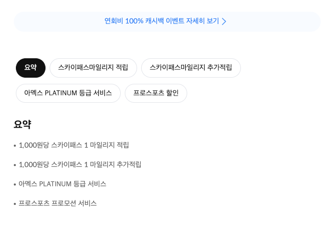 앤마일리지 카드는 연회비 4만 9천 원이며, 아멕스 플래티넘 등급 서비스를 제공하고 있습니다. 실생활에서 자주 사용하는 5가지 항목을 앤 마일리지로 결제 시 1 천원당 2 마일리지를 적립해 주는 것을 마일리지 쌓는데 큰 도움이 됩니다.