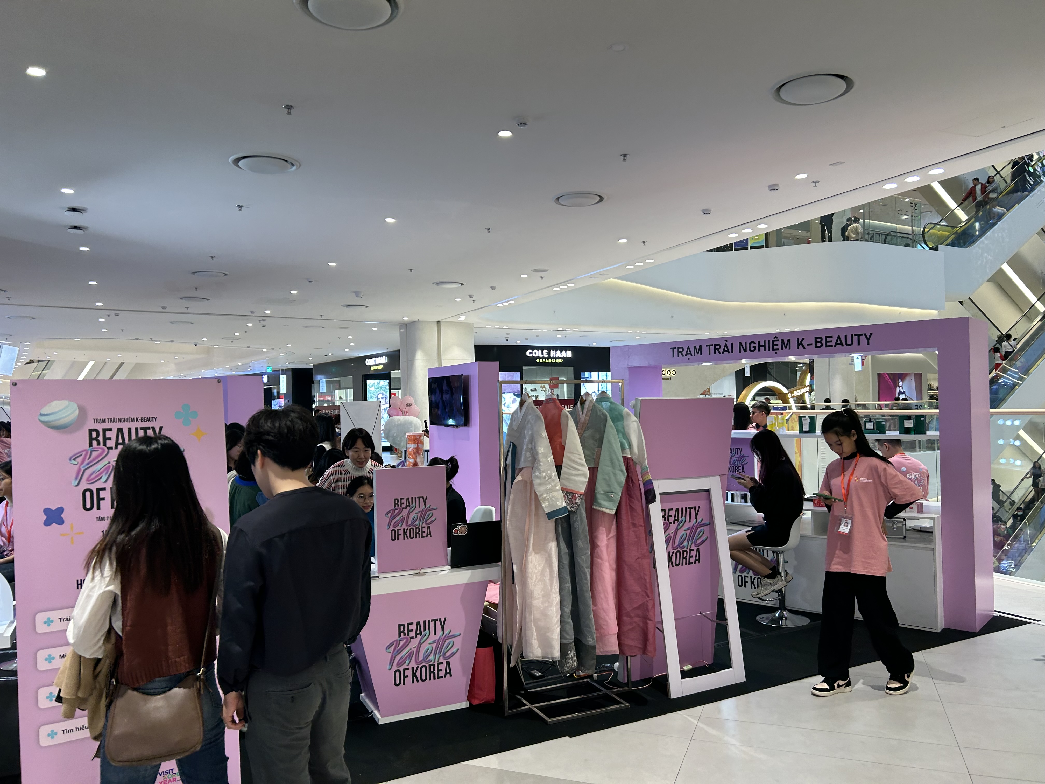 팝업 스토어에서는 K뷰티 이벤트가 진행 중이었습니다. 한복 체험존과 메이크업 존이 있었습니다.
