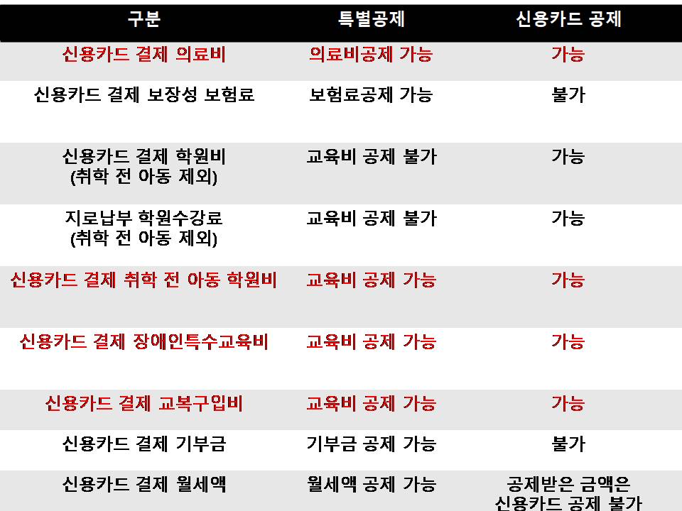신용카드로 사용한 금액으로 특별공제가 가능한지 확인하였습니다. 중복으로 공제가 가능한 4 가지 항목이 있었습니다. 신용카드로 결제한 의료비의 경우 의료비 공제와 신용카드 공제가 중복으로 가능하였습니다. 신용카드로 결제한 미취학 아동의 학원비의 경우에도 교육비 공제와 신용카드 공제가 가능하였습니다. 장애인 특수 교육비의 경우에도 교육비 공제와 신용카드 공제가 가능하였습니다. 신용카드로 결제한 교복 구입비도 교육비 공제가 가능하면서 신용카드 공제가 가능한 항목이었습니다. 그 외에 특별공제는 가능하나 신용카드 공제가 불가능한 항목은 아래 표를 참고하시면 됩니다.