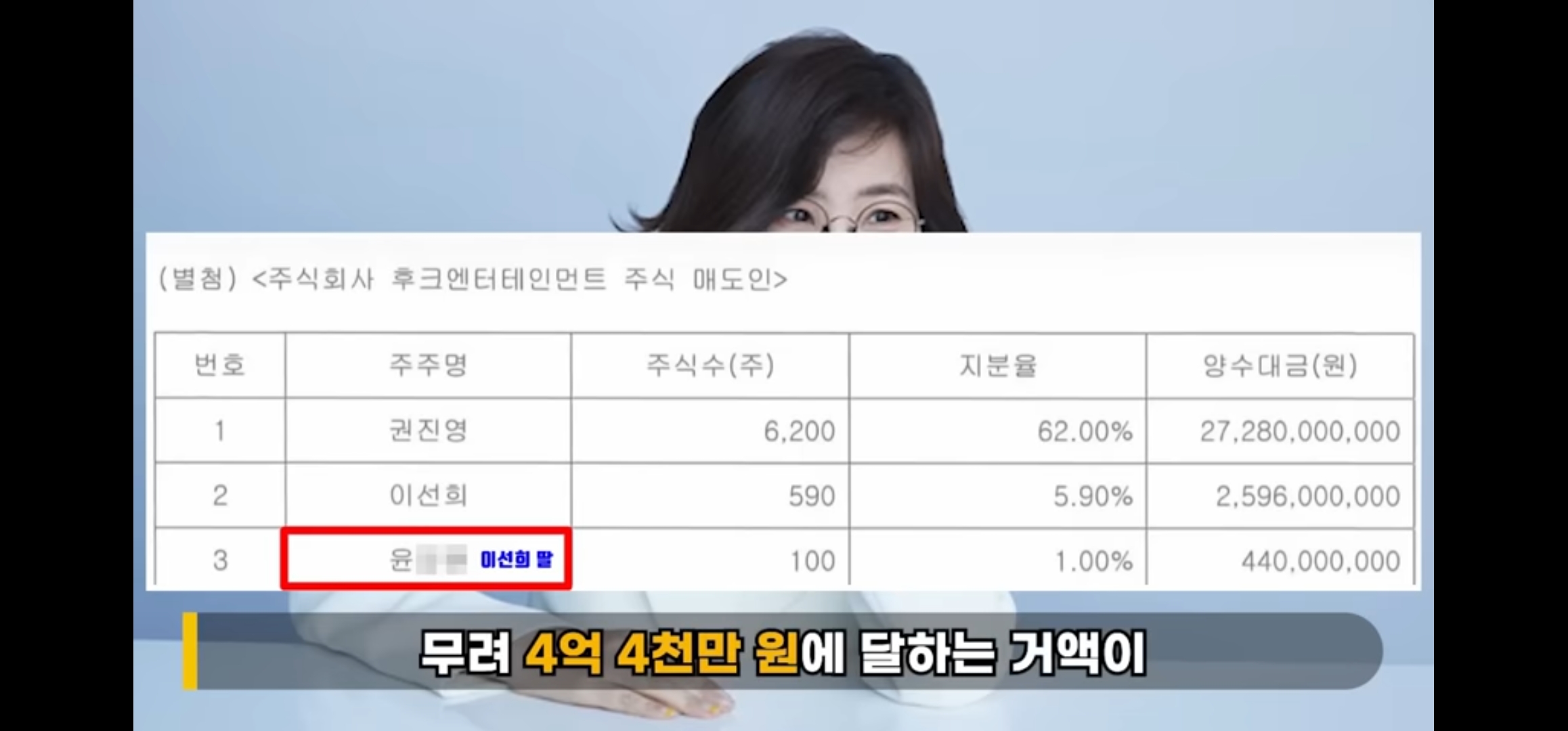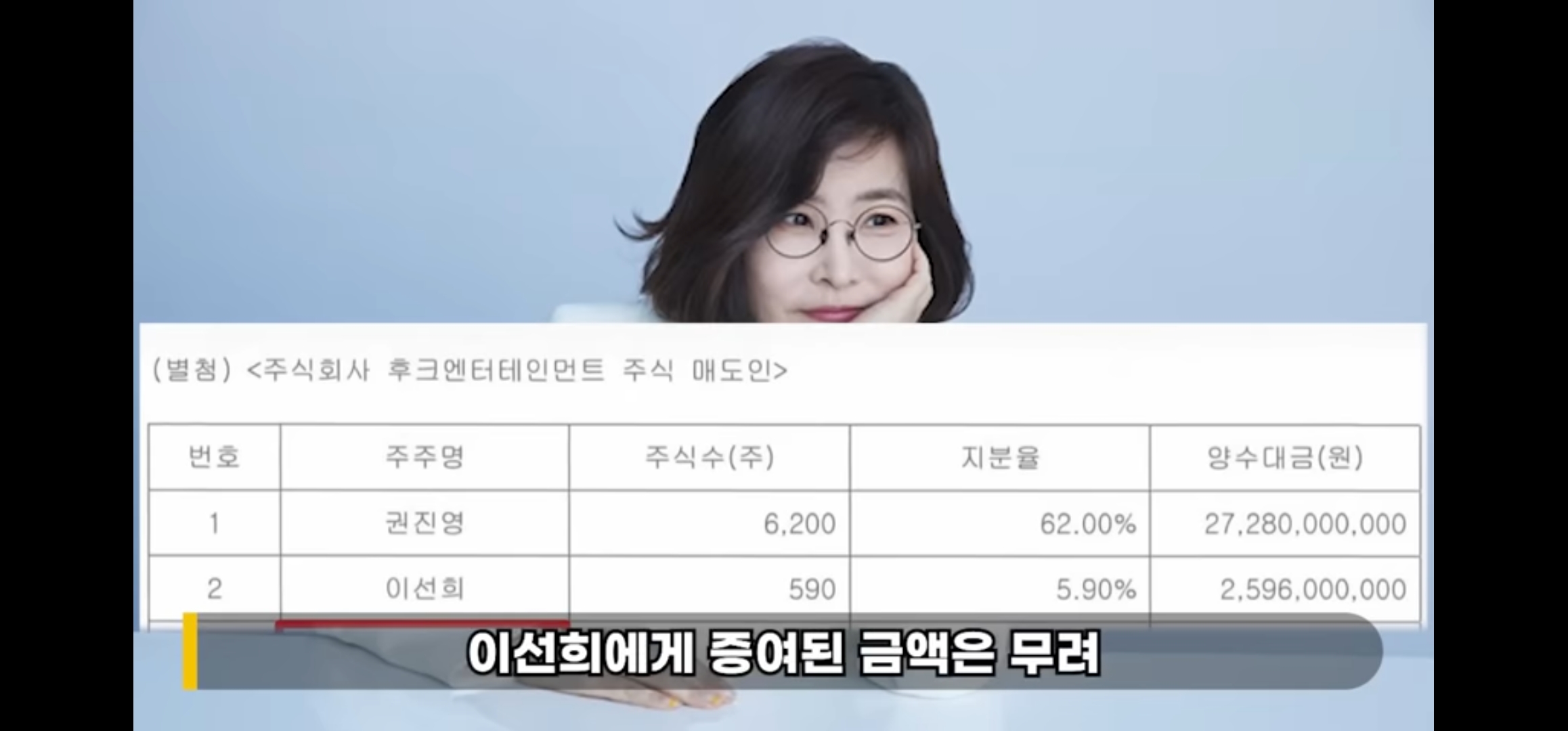 권진영 대표가 초록뱀미디어에 자신의 지분을 매도하면서 받은 금액 중 167억원을 훅 엔터테인먼트 소속 연예인과 임직원들에게 무상 증여를 하였습니다. 그러던 중 이선희와 이선희 가족에게 증여된 금액이 있었습니다. 이선희에게는 25억 9,600만 원이 증여되었고, 후크 엔터테인먼트와 관계없는 이선희의 딸 윤 씨에게 4억 4,000만 원이 증여되었습니다. 임직원에게는 4천400만 원이 증여된 것에 비교하면 아무 관계없는 이선희의 딸에게 상당히 많은 금액이 증여되었습니다. 법적으로는 개인 재산을 증여한 것이기 때문에 문제는 없지만 사람들이 보기에는 수상하게 느껴지는 부분입니다. 이러한 금전적인 혜택 때문에 이선희가 제자 이승기의 싸움에 아무런 입장하지 않는 것일까요?