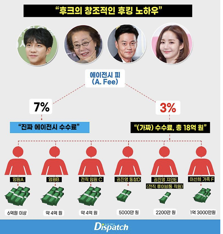 이 와중에 후크 엔터테인먼트는 이승기에게 추가로 6억 3천만 원을 추가로 입금하였습니다. 확인 결과 이 금액은 광고 정산료 명목으로 입금된 금액입니다. 이승기는 후크엔터테인먼트에게 미정산된 음원 수익료를 정산해달라는 소송을 걸었는데 왜 후크엔터테인먼트는 이승기에게 광고 정산료를 입금했을까요? 통상적으로 광고 에이전트에게 10%의 수수료를 지급하였는데, 후크엔터테인먼트는 수수료를 7%로 낮추고 나머지 3%를 별도로 챙겼습니다. 3%의 금액을 회사 임직원들이 이름을 돌려가며 수익을 수령하고 있다는 의혹이 있었는데, 이번에 이승기에게 6억 3천만 원을 별도로 정산하면서 의혹이 확신으로 밝혀졌습니다. 이에 이승기는 회사 임직원들을 사기 혐의로 고소하였습니다.