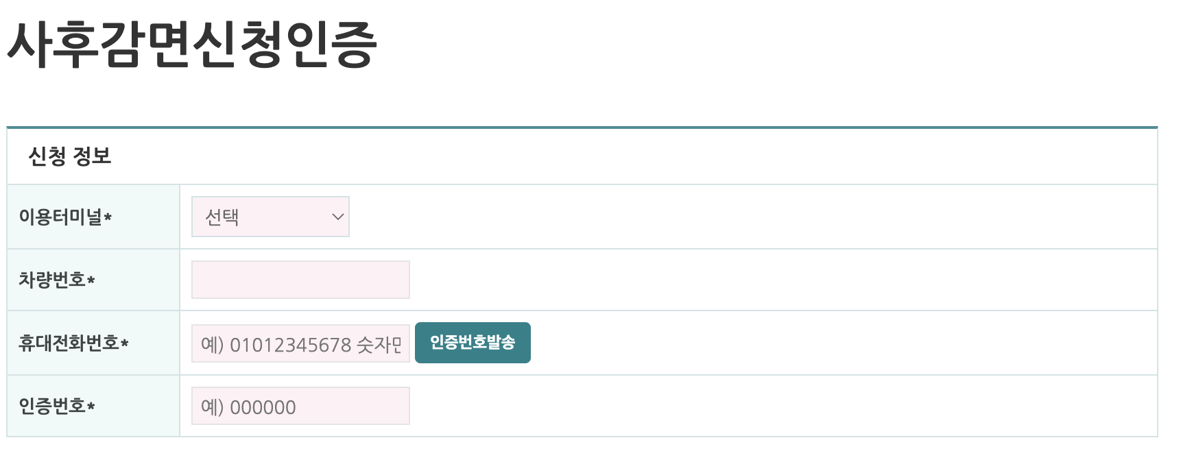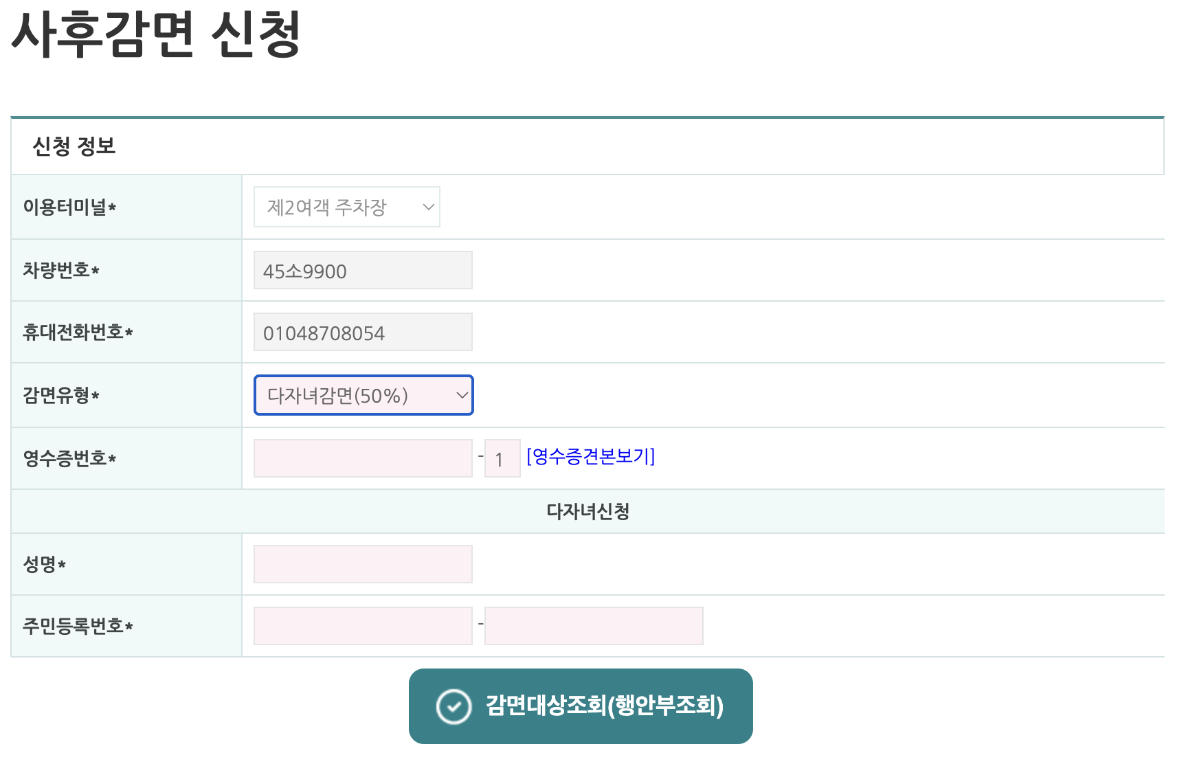 차량번호, 연락처, 감면유형, 영수증번호를 입력하여야 합니다.