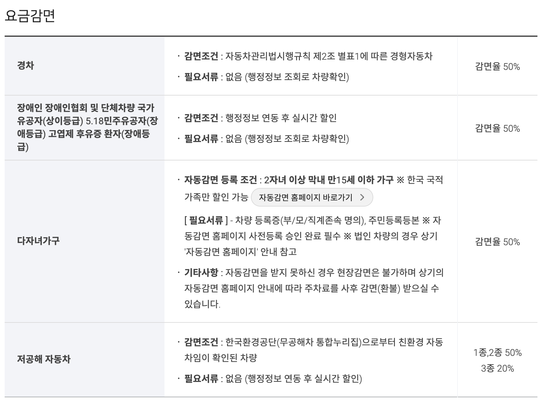 1. 경차, 2. 장애인,국가유공자, 고엽제후유증 환자, 3. 다자녀 가구, 4. 저공해 자동차