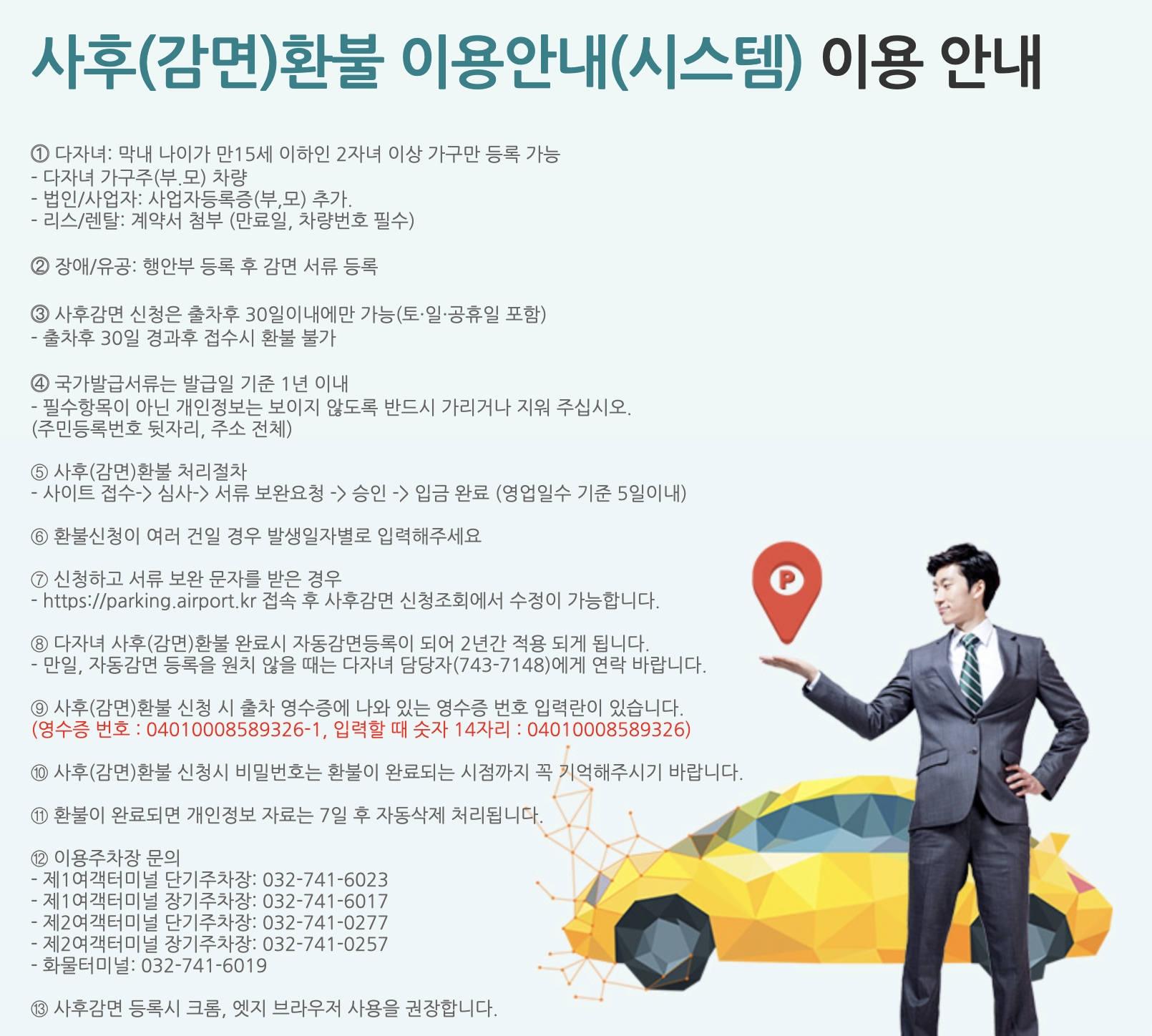 다자녀가구 사전등록을 못해서 주차비 전액을 내었다면, 인천공항 정기권 관리 시스템에서 사후감면 등록을 50%를 환급받을 수 있습니다.