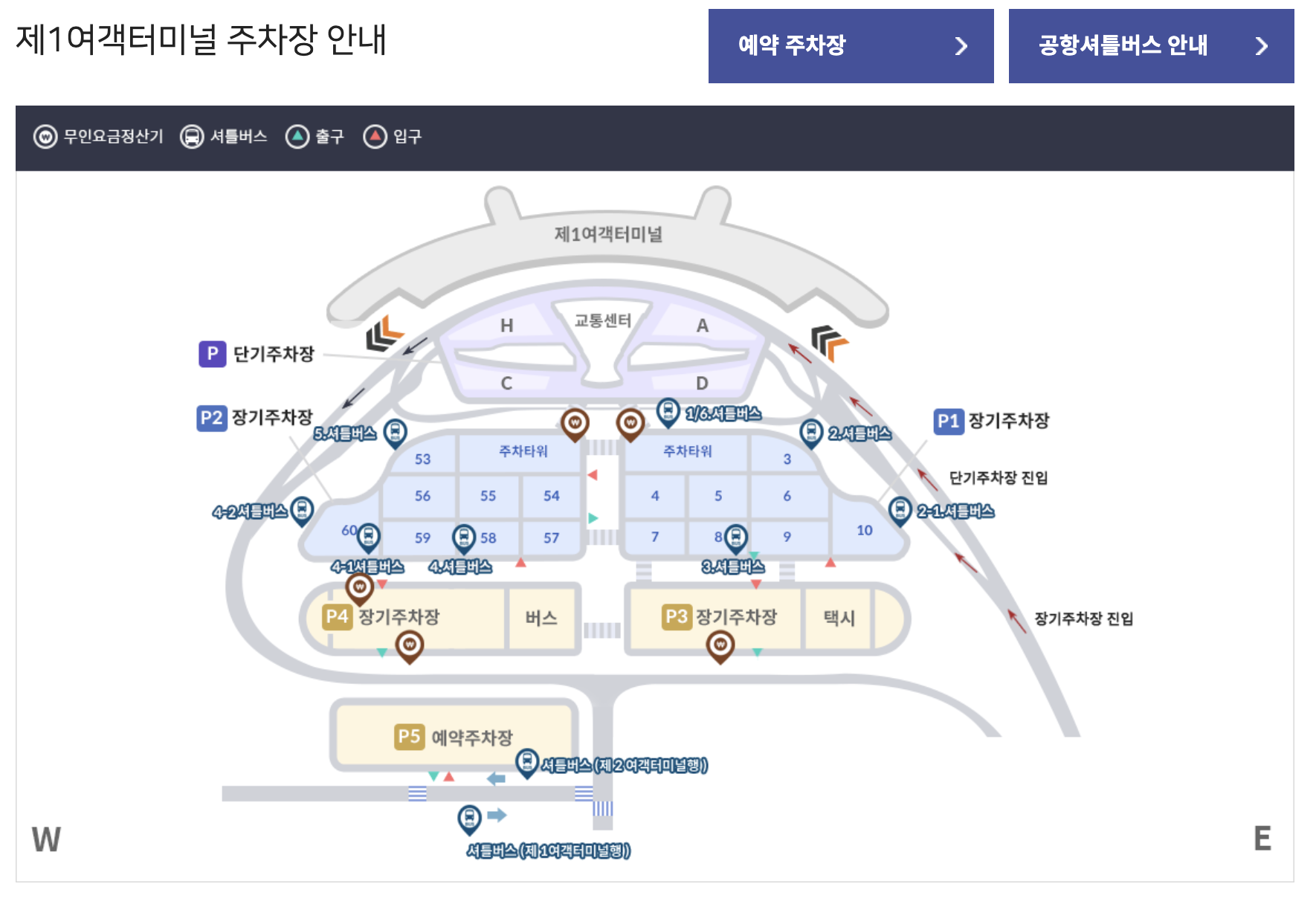 장기주차장과 예약주차장은 1일 9천원의 가격으로 저렴하게 이용할 수 있습니다. 하지만 출국장, 입국장으로 가기위해서 셔틀을 이용해야하는 불편함이 있습니다.