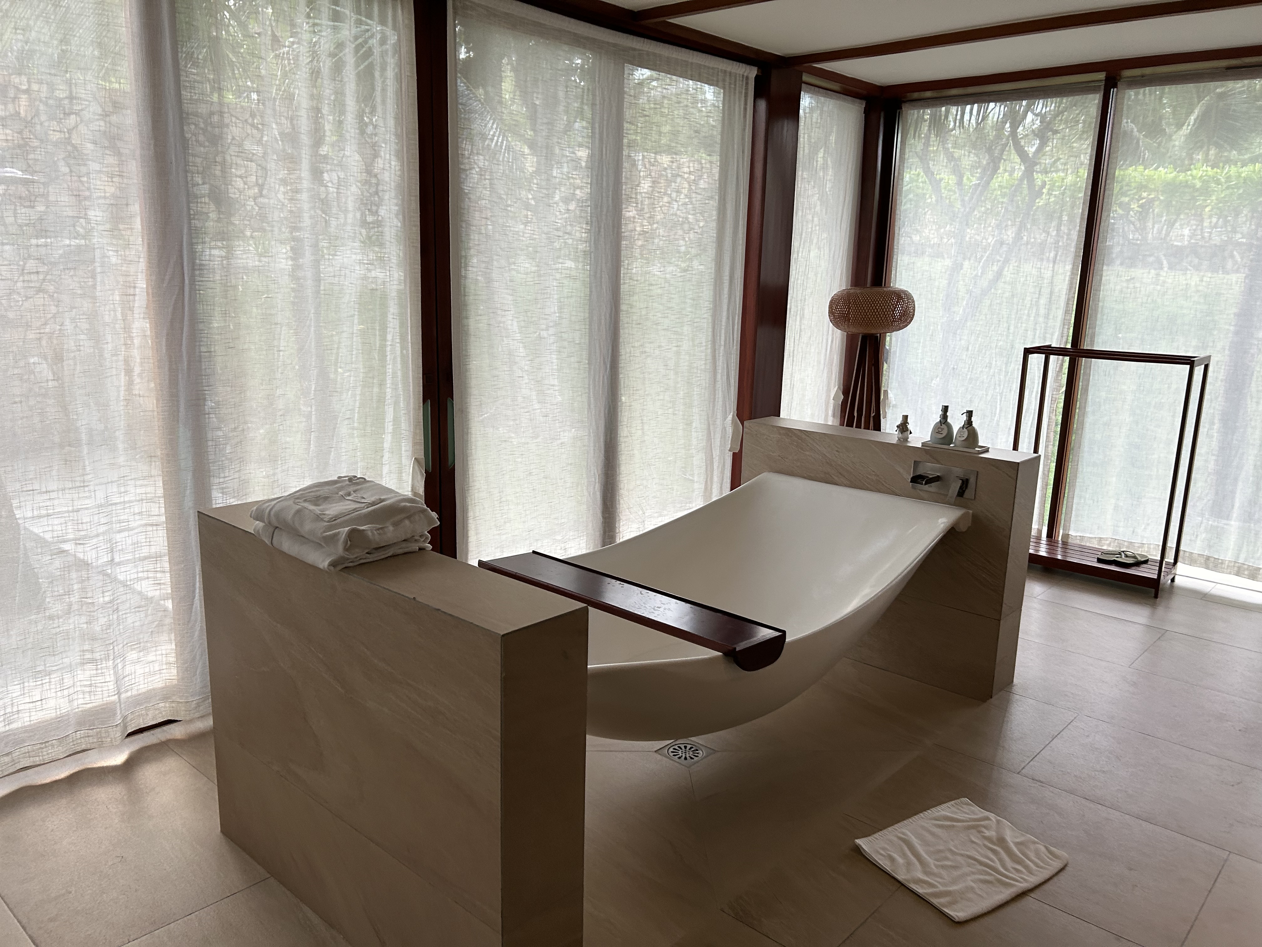 퓨전리조트 깜란하면 떠오르는 신기하게 생긴 욕조도 신기하네요. 욕조가 공중에 떠있어서 배수는 바로 아래로 흐르게 되어있습니다.