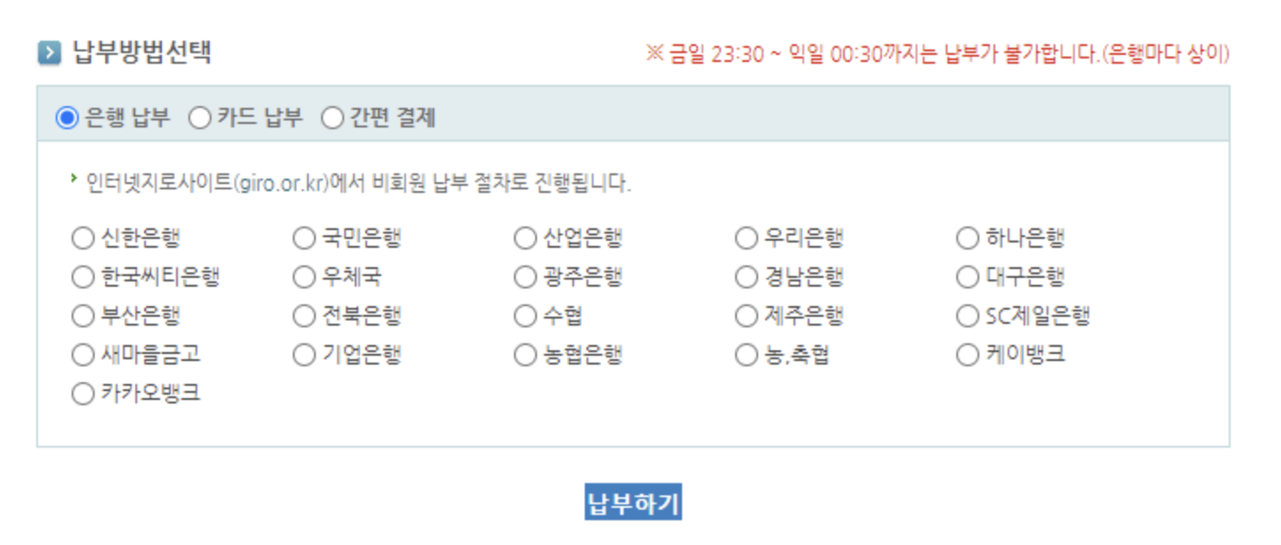 납부 방법은 은행 납부, 카드 납부, 간편 결제가 가능합니다. 간편 결제에는 카카오페이, 삼성페이, 네이버 페이 등이 있어 각자 편한 방법을 선택하여 납부할 수 있습니다.