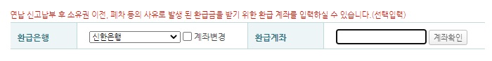 만약 연납 후 2023년 내 차량을 판매하거나 폐차 혹은 수출을 할 경우, 위텍스 자동차세 환급을 받을 수 있습니다. 연납 납부 신청을 할 때 환불받을 계좌도 같이 입력하여야 합니다. 신한은행이 아닐 경우 시간이 다소 걸릴 수 있다는 안내문이 나오니 참고하면 됩니다.