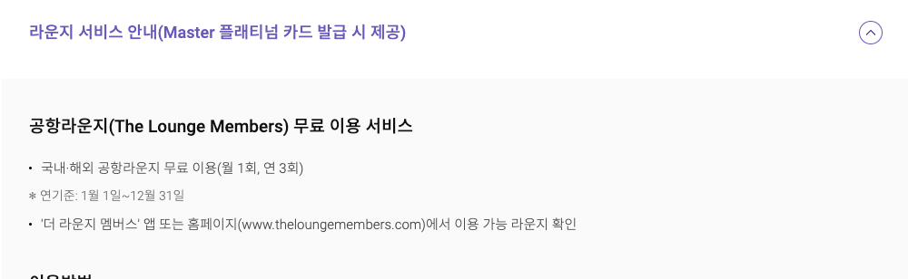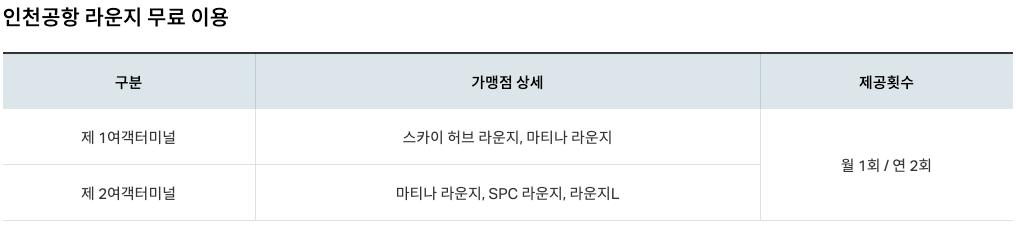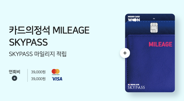 연회비 3만 9천 원으로 기본적으로 1 천원당 대한항공 스카이패스 1마일리지를 적립해주고 해외에서 일시불로 결제할 경우 추가로 1마일을 더 제공해 1천원당 2마일을 제공해주고 있습니다. 그리고 전 세계 공항라운지 무료이용 서비스를 연 3회 제공하고 있습니다.