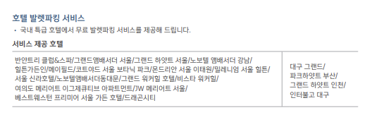 연회비 4만 5천 원인 스카이패스 티타늄 카드는 1 천원당 1마일리지를 적립해주고 특별 적립으로 해외 이용과 면세점 이용 시 1마일리지를 추가로 적립해 1천원당 2 마일리지를 적립해주고 있습니다. 공항 라운지 연 2회 서비스를 제공하고 연 12회 국내 호텔 발레파킹 무료 서비스를 제공하고 있습니다. 연회비 4만 5천 원 수준의 카드 중 호텔 발레파킹 서비스는 사용자에 따라 혜자혜택이 될 수 있습니다.