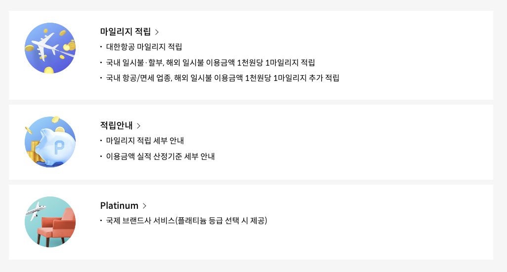 앞서 현대카드와 삼성카드 정리를 해놓은 포스팅도 참고하시면 더 많은 대한항공 마일리지 카드 종류를 확인하실 수 있습니다.