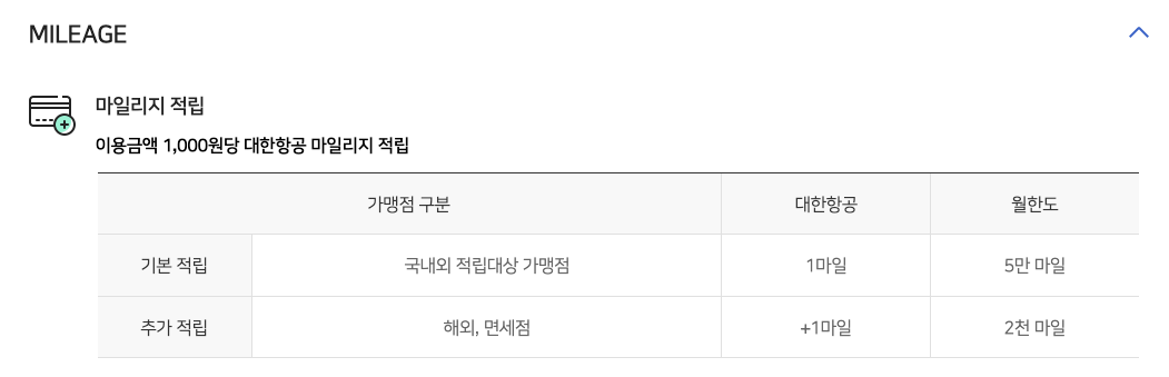 카드사별 대한항공 마일리지 적립 카드