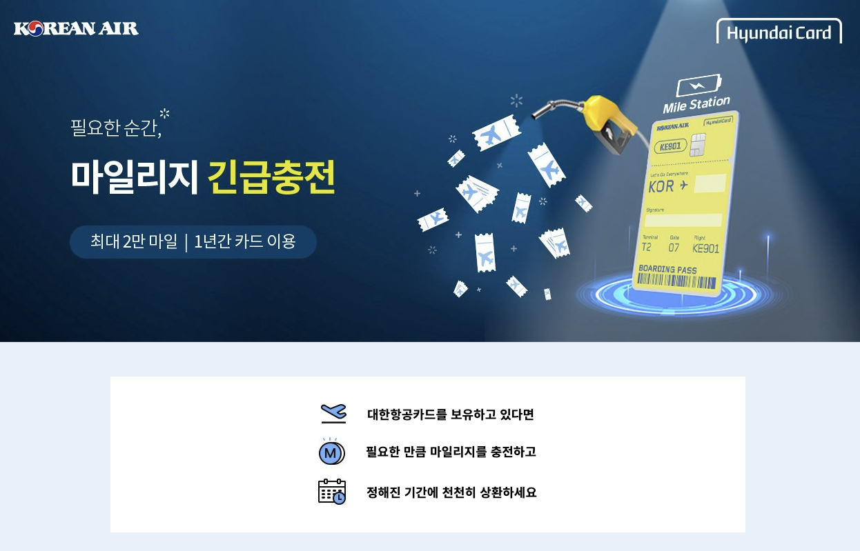 마일리지를 이용해서 보너스 항공권을 예매하고 싶은데 마일리지가 부족해서 못하는 경우가 생길 수 있습니다. 이런 경험을 해본 사람들이라면 '마일리지를 빌릴 수 있으면 좋겠다'라고 생각해 봤을 겁니다. 그런 사람들에게 현대카드 마일리지 카드는 도움을 줄 수 있습니다. 마일리지를 최대 2만 마일까지 긴급충전해서 사용할 수 있습니다. 먼저 받은 2만 마일은 카드를 사용하면서 갚아나가는 제도입니다.