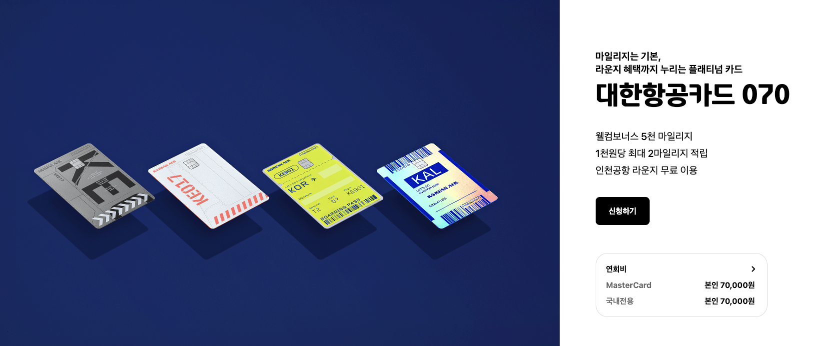 현대 카드 070은 연회비가 7만 원이며, 웰컴보너스로 5천 마일리지를 적립하여 줍니다. 특별마일리지를 통해 최대 1 천원당 2 마일리지를 적립할 수 있습니다.
