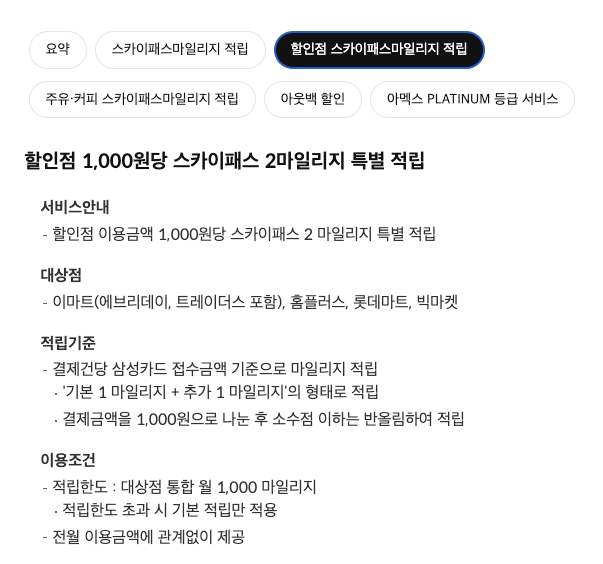 스페셜 마일리지 카드는 연회비 9만9천원 입니다. 위에 두 카드와 다른 점은 할인점(이마트, 홈플러스, 롯데마트, 빅마켓), 주유소, 커피숍 이용 시 1천 원 당 2 마일리지를 적립하여 주는 것과 아웃백 3만 원 청구할인을 제공한다는 점입니다. 할인점을 많이 이용하는 사람들에게 적합한 카드입니다.