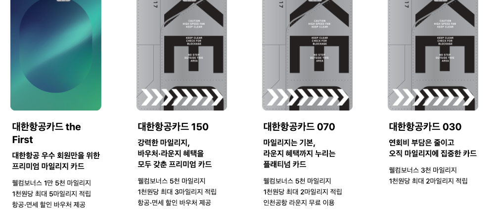 현대카드는 대한항공카드 4종을 보유하고 있습니다. 가장 높은 등급부터 The first, 150, 070, 030이 있습니다. 모든 카드는 기본적으로 1천 원 당 1 마일리지를 적립하여 주고, 카드별로 특별마일리지를 제공하고 있습니다. 저는 070 카드를 4년째 사용하고 있습니다. 여러 가지 디자인을 고를 수 있는 장점이 있습니다. 저는 보딩패스 모양의 디자인을 골라서 잘 사용하고 있습니다.