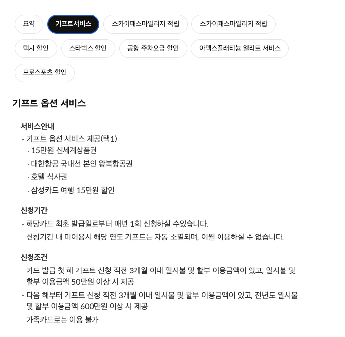 THE 1 카드는 연회비가 25만 원으로 다소 비싸지만, 1년에 1회 기프트서비스를 제공해 주어서 체감상 연회비가 비싸지 않게 느껴집니다. 25만 원 연회비를 내면 15만 원 신세계상품권 혹은 호텔식사권 2매 혹은 4매(호텔마다 차등 지급) 등 꽤 비싼 서비스를 제공해주고 있습니다. 삼성카드 마일리지 카드 중 유일하게 아멕스 플래티넘 엘리트 혜택을 제공하고 있습니다. 아멕스 플래티넘 엘리트 혜택으로 서울 시내 주요 호텔 발레파킹 무료 서비스는 유용하게 사용할 수 있습니다.