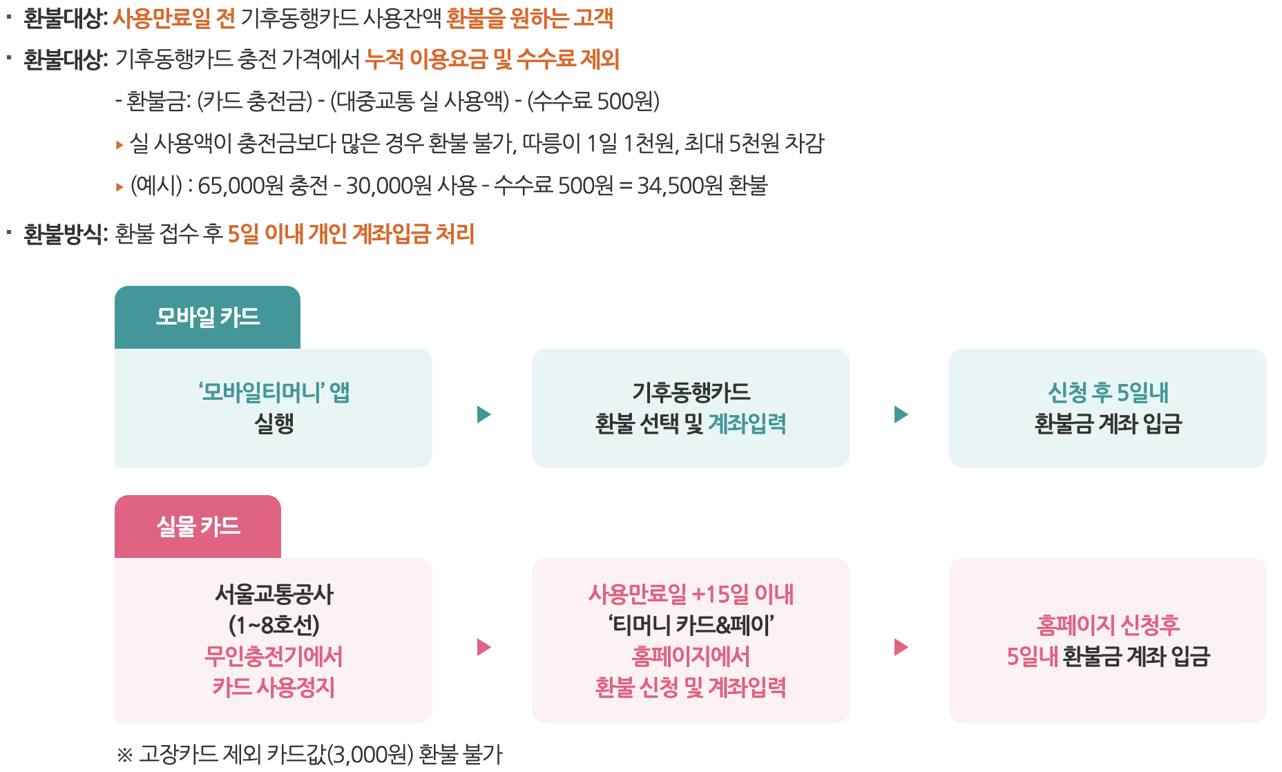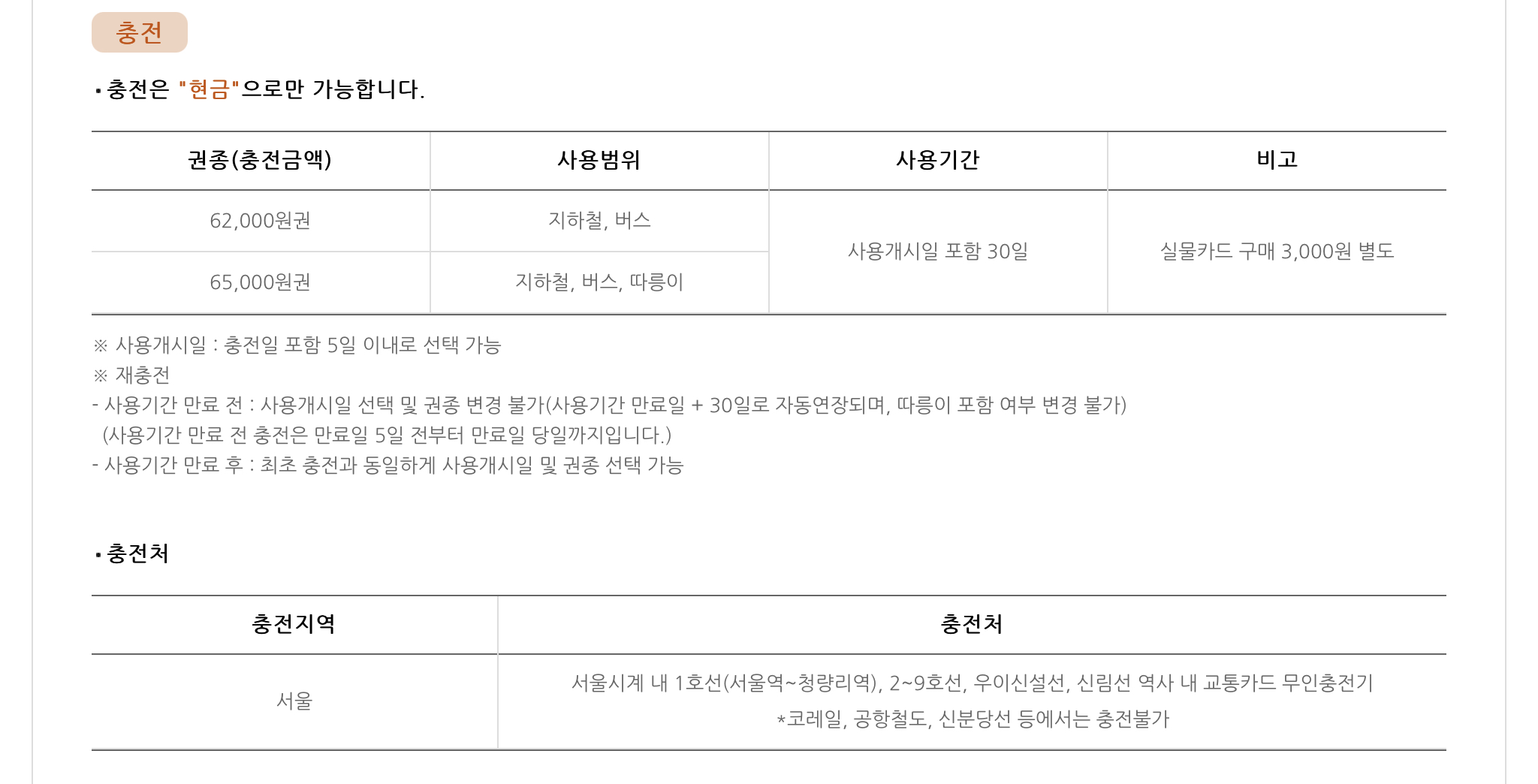 충전 : 실물카드는 지하철 역사 내 무인충전기를 통해서 충전이 가능하며, 모바일카드는 계좌이체를 통해서 충전 가능합니다!
