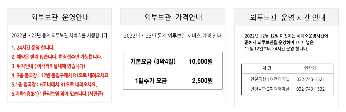 탑승권을 제시하면 1인당 1벌의 옷을 5일간 무료 보관이 가능합니다. 5일 경과 시 1일 당 2,500원 혹은 350 마일리지가 공제됩니다.