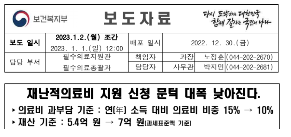재난적 의료비 지원 대상 질환은 미용, 성형 등을 제외한 모든 질환으로 확대되었습니다. 기존에는 6대 중증질환(암, 뇌혈관질환, 심장질환, 희귀질환, 중증 화상, 중증 외상)으로 제한되었지만, 이제는 대상이 크게 확대 되었습니다. 지원 금액은 연 5,000만원(기존 3,000만원)으로 증가하였습니다. 기존에는 의료비 부담이 연간 가구 소득의 15%를 넘는 경우 재난적 의료비를 받을 수 있었지만, 올해부터는 가구 소득 10%를 넘는 경우부터 받을 수 있게 변경되었습니다. 재산 기준은 과세표준액 7억원 이하로 완화되었습니다.