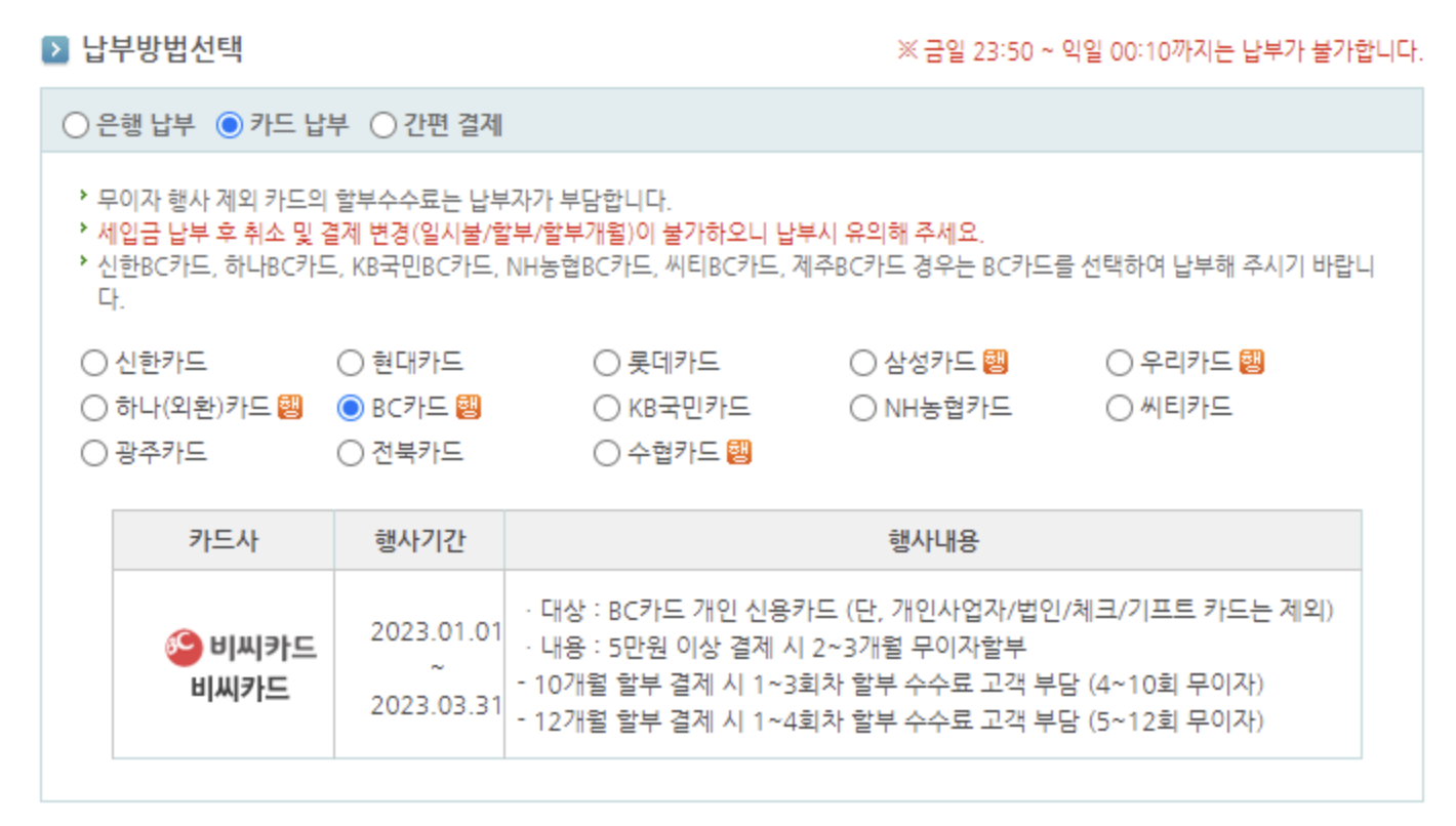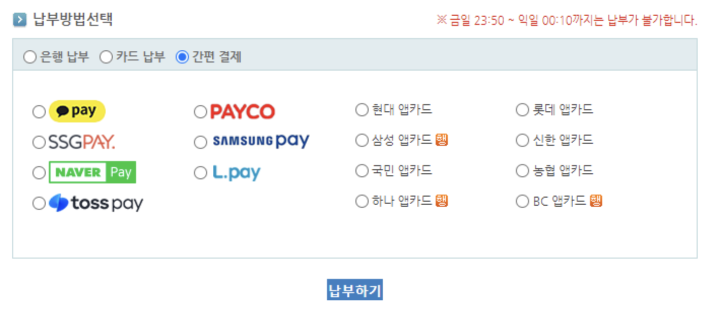납부 방법은 은행 납부, 카드 납부, 간편 결제가 가능합니다. 간편 결제에는 카카오페이, 삼성페이, 네이버 페이 등이 있어 각자 편한 방법을 선택하여 납부할 수 있습니다.