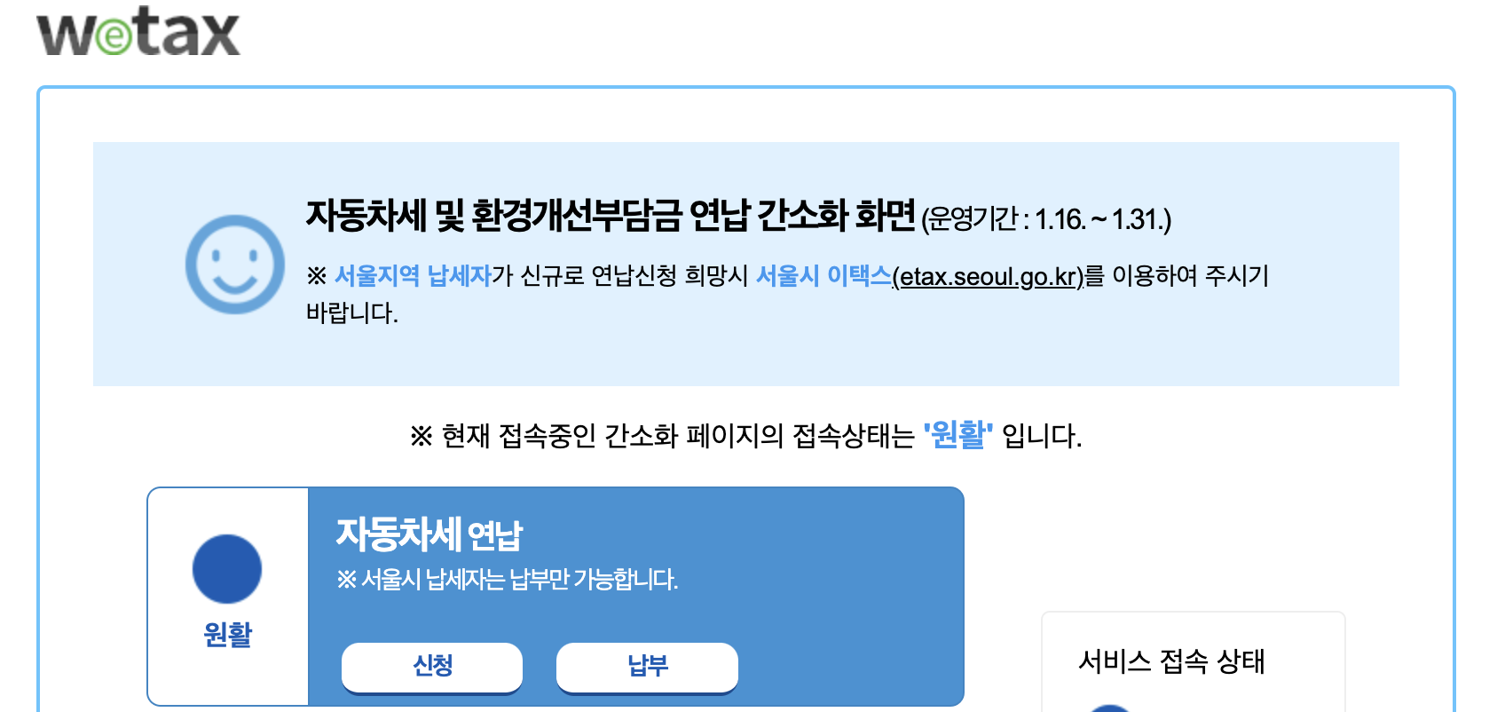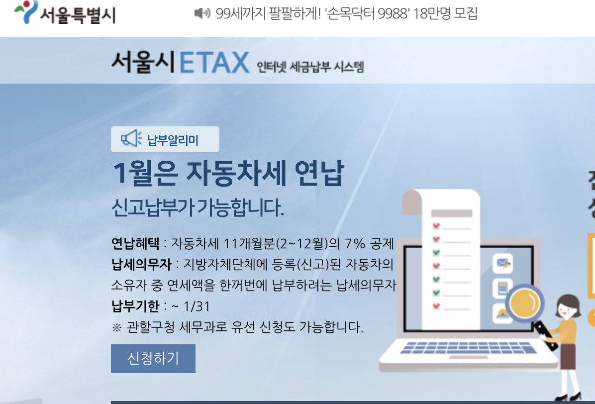 서울의 경우 이텍스에서 연납 신청 및 납부를 할 수 있고, 다른 지역의 경우는 위택스에서 신청 및 납부가 가능합니다. 해당 홈페이지에 들어가서 자동차세 금액을 확인 후 납부 신청을 진행하면 됩니다.