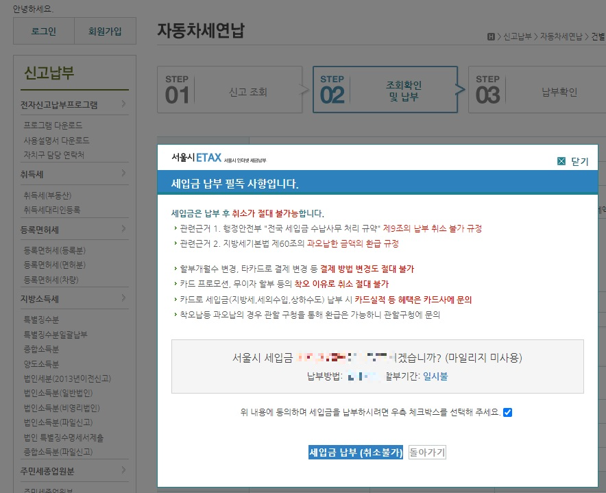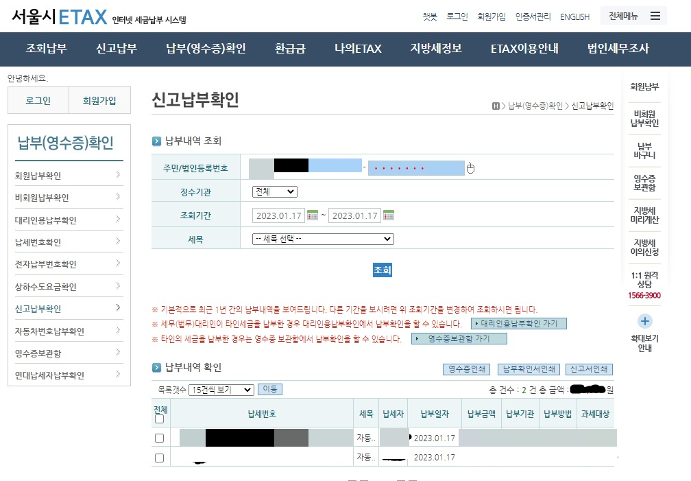 자동차세 연납을 완료하면, 납부확인에서 영수증 조회가 가능합니다.