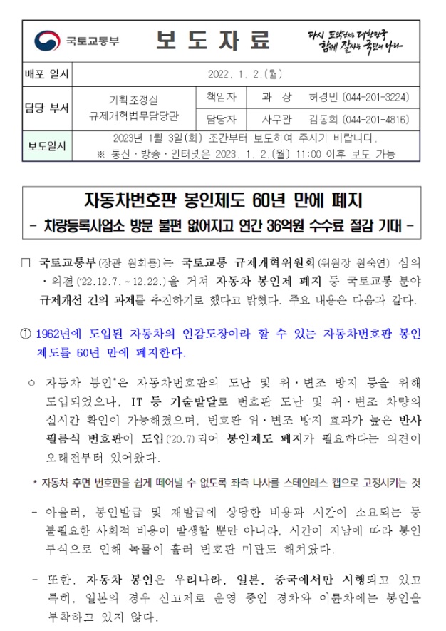 자동차 봉인 제도는 도난 및 위,변조 예방과 판별을 위하여 1962년 도입되었던 제도 입니다. 자동차 봉인 제도는 전세계에서 우리나라와 일본 그리고 중국에서만 시행되고 있습니다. 일본의 경우 경차와 이륜차는 신고제로 운영중으로 봉인 번호판을 사용하지 않고 있습니다. 자동차 후면 번호판 봉인은 차량 등록 사업소를 통하지 않으면 불가능하였습니다. 후면 변허판을 쉽게 떼어낼 수 없도록 좌측 나사를 스테인레스 캡으로 고정시켜놓는 봉인 제도는 이전에는 도난 및 위,변조 방지에 용이하였지만, 최근 IT 기술의 발달로 실시간으로 도난 및 위,변조를 확인할 수 있게 되면서 사실상 무용지물인 제도가 되었습니다. 자동차 번호판 봉인 폐지를 통하여 번호판 교체 및 재발급을 위하여 사용되던 상당한 비용과 시간이 줄어들 수 있는 것으로 예상됩니다. 번호판 봉인 폐지를 통하여 연간 36억원 절감 효과가 나올 것으로 예상하고 있습니다.